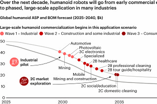 Over the next decade, Bain expects humanoid robots to move from experimental deployments to large-scale use across three successive waves.