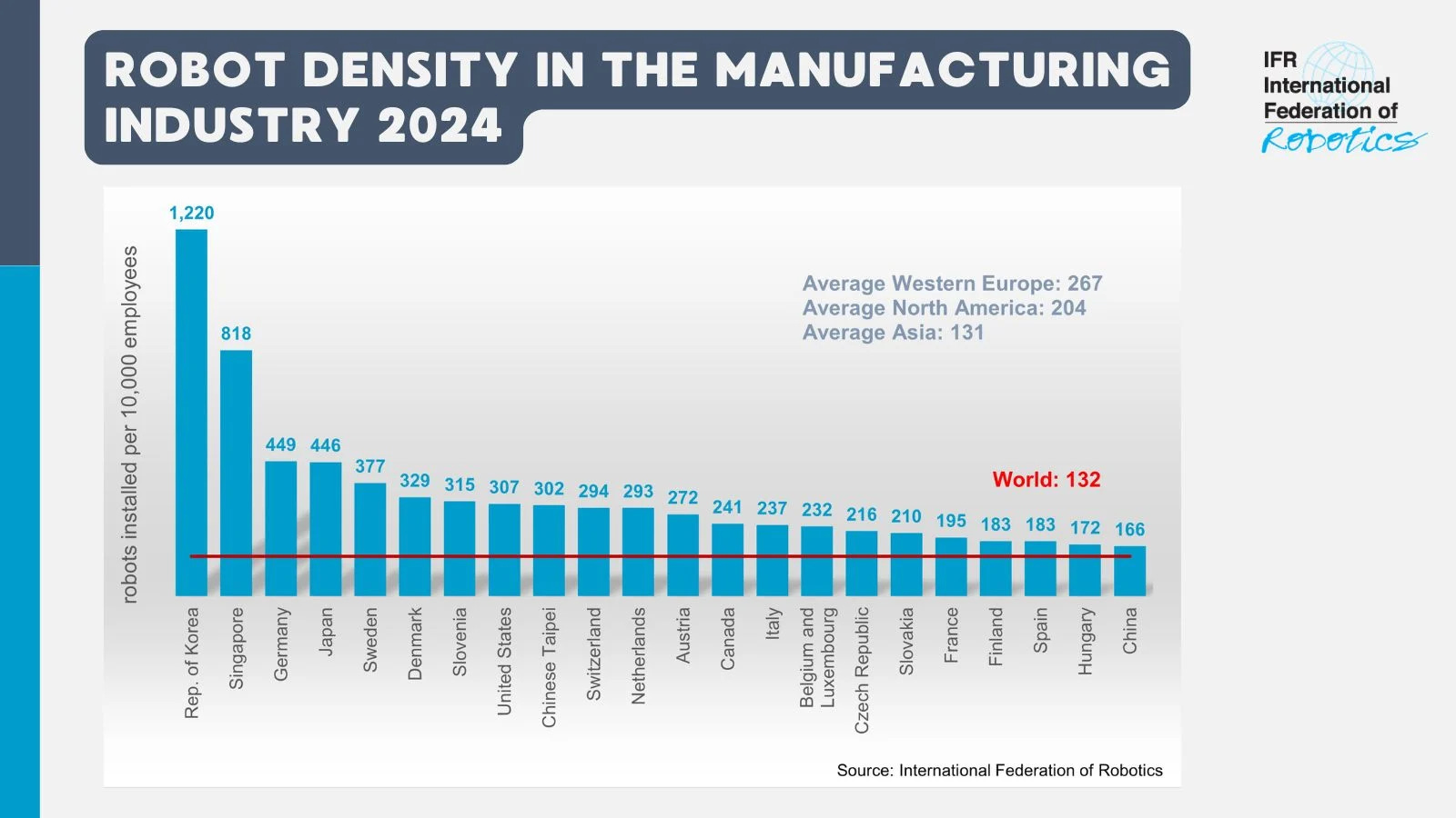 The Republic of Korea maintains the world’s highest robot density with 1,220 robots per 10,000 employees, benefiting from its dominant electronics and automotive sectors. Singapore follows in second place with 818 units, while Japan ranks fourth with 446. The United States ranks eighth worldwide with 307 units, representing a 4 percent year-on-year increase.